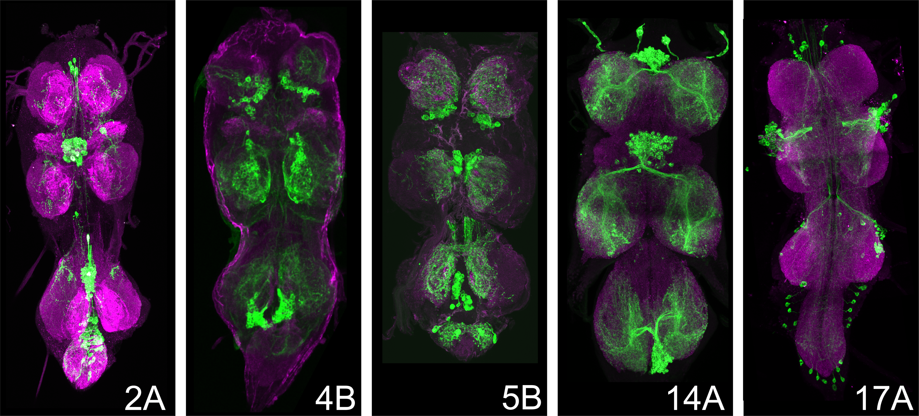 Some hemilineage lines (e.g., 5B; Figure 1) are maintained as stable stocks, in which all required genetic components are present in a single line. Other hemilineages (e.g., 2A, 17A, 14A; Figure 1) require genetic crosses to combine the split-GAL4 hemidrivers and the UAS-CsChrimson effector. These crossed lines are typically maintained over balancer chromosomes, which carry visible markers (e.g., Bar eyes for the 1st chromosome (an indent or narrow slit) Curly wings for the 2nd chromosome and a Tubby body shape for the third chromosome). For experimental use, instructors must identify and select flies carrying the correct genotype. For instructors versed in fly genetics, simply select against balancer markers to isolate progeny that contain both split-GAL4 hemidrivers and the UAS-CsChrimson effectors. Alternatively, instructors may briefly illuminate candidate flies and select individuals that show the expected activation phenotype.