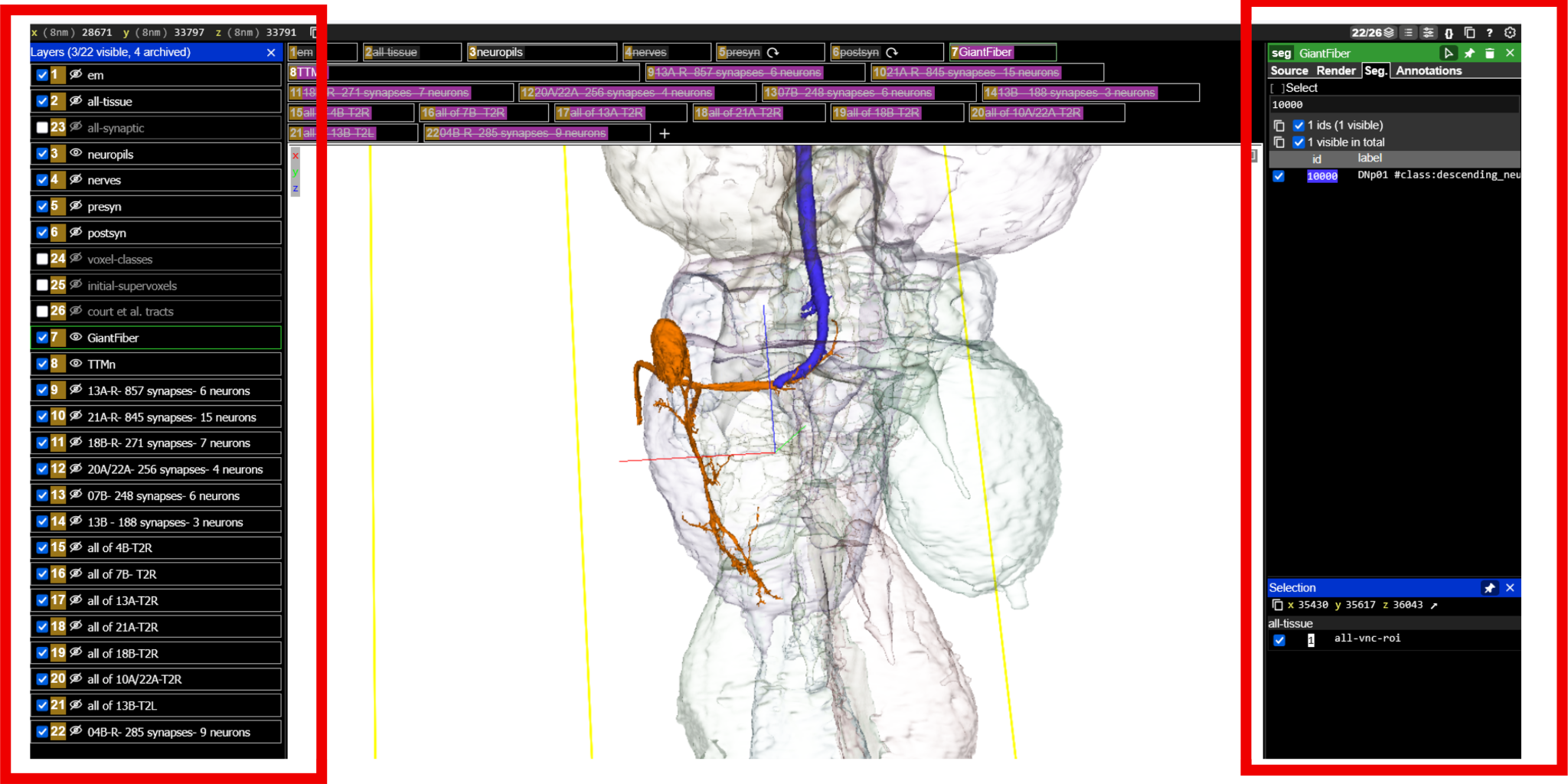 Using the Neuroglancer view and dataset, address the following: